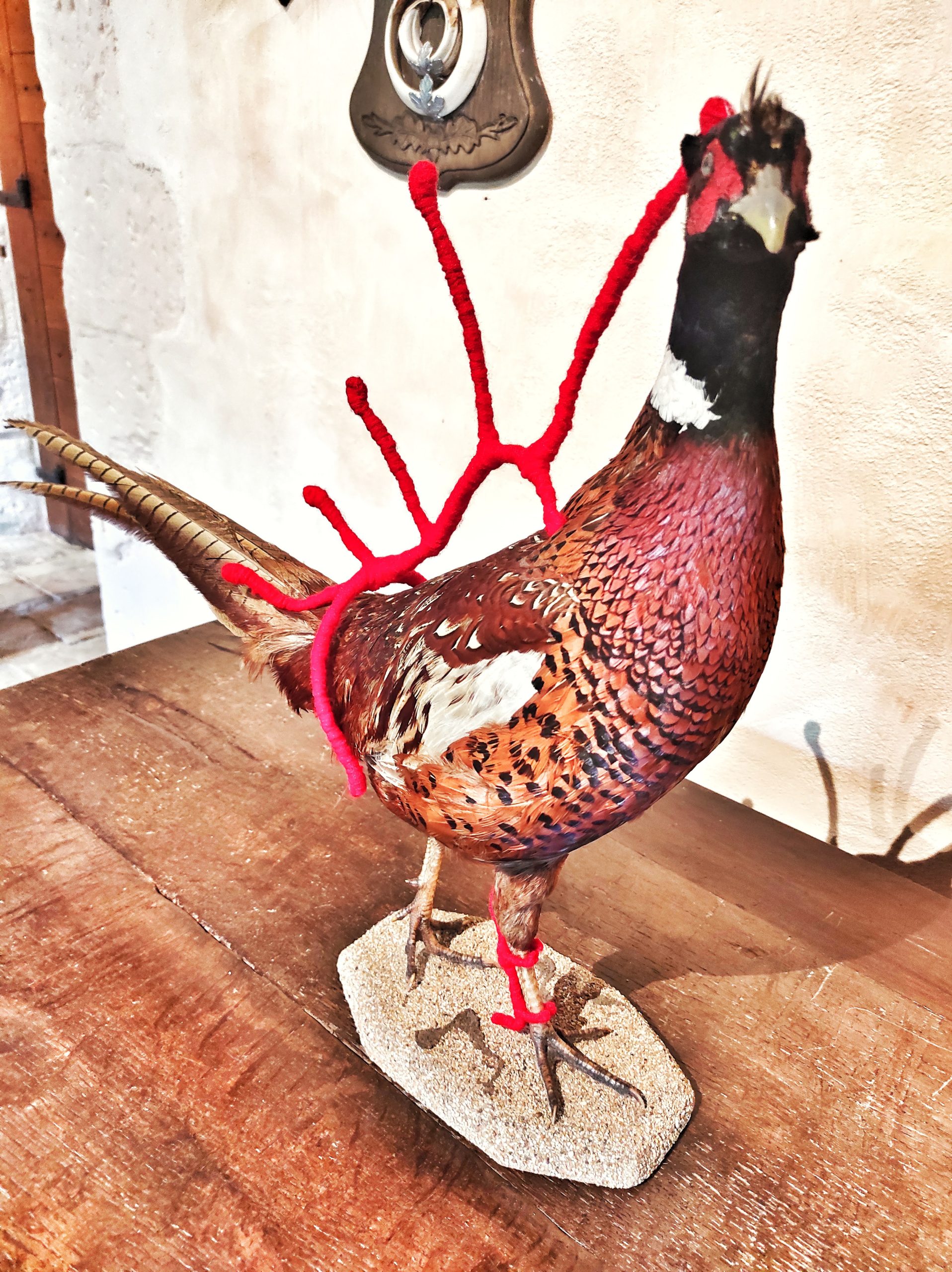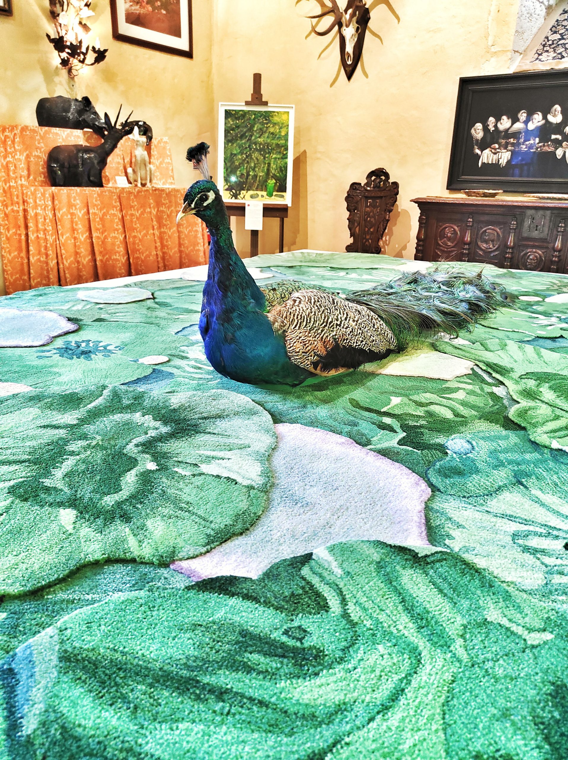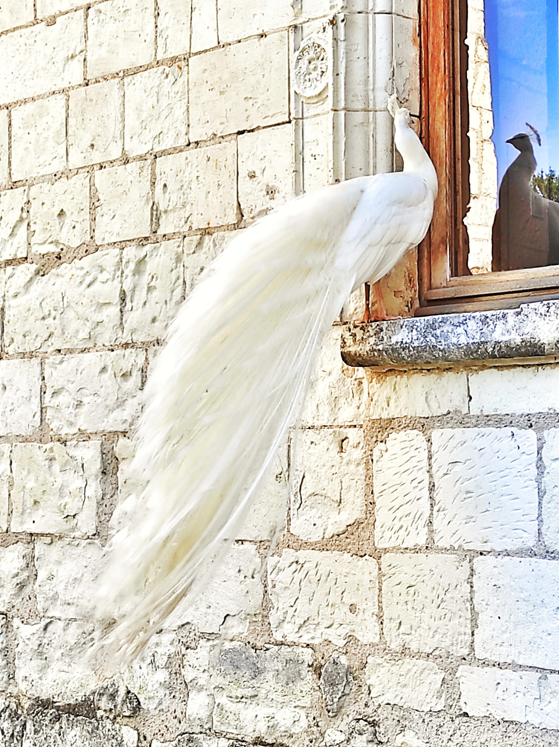 Nous traversons le pont-levis pour arriver dans la cour. Nous sommes acceuillis par un magnifique paon blanc. Attendez-vous à en croiser un ou deux pendant votre visite ! Ils font parti du décor…