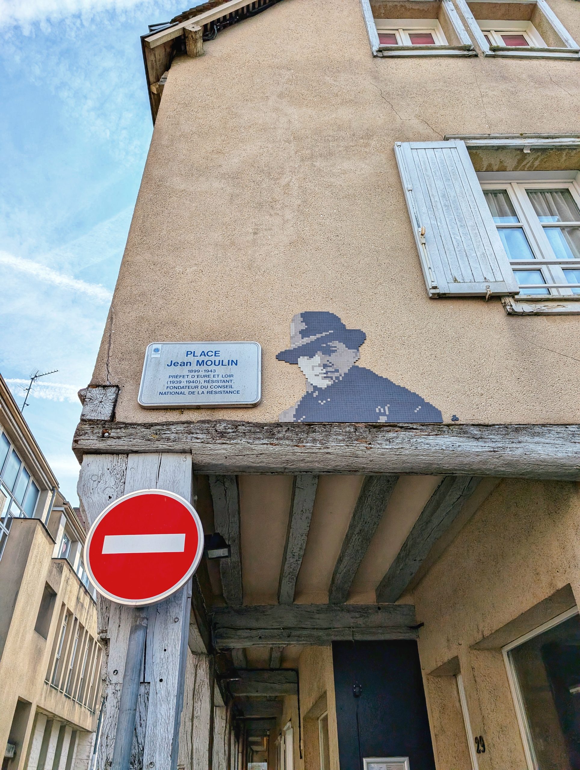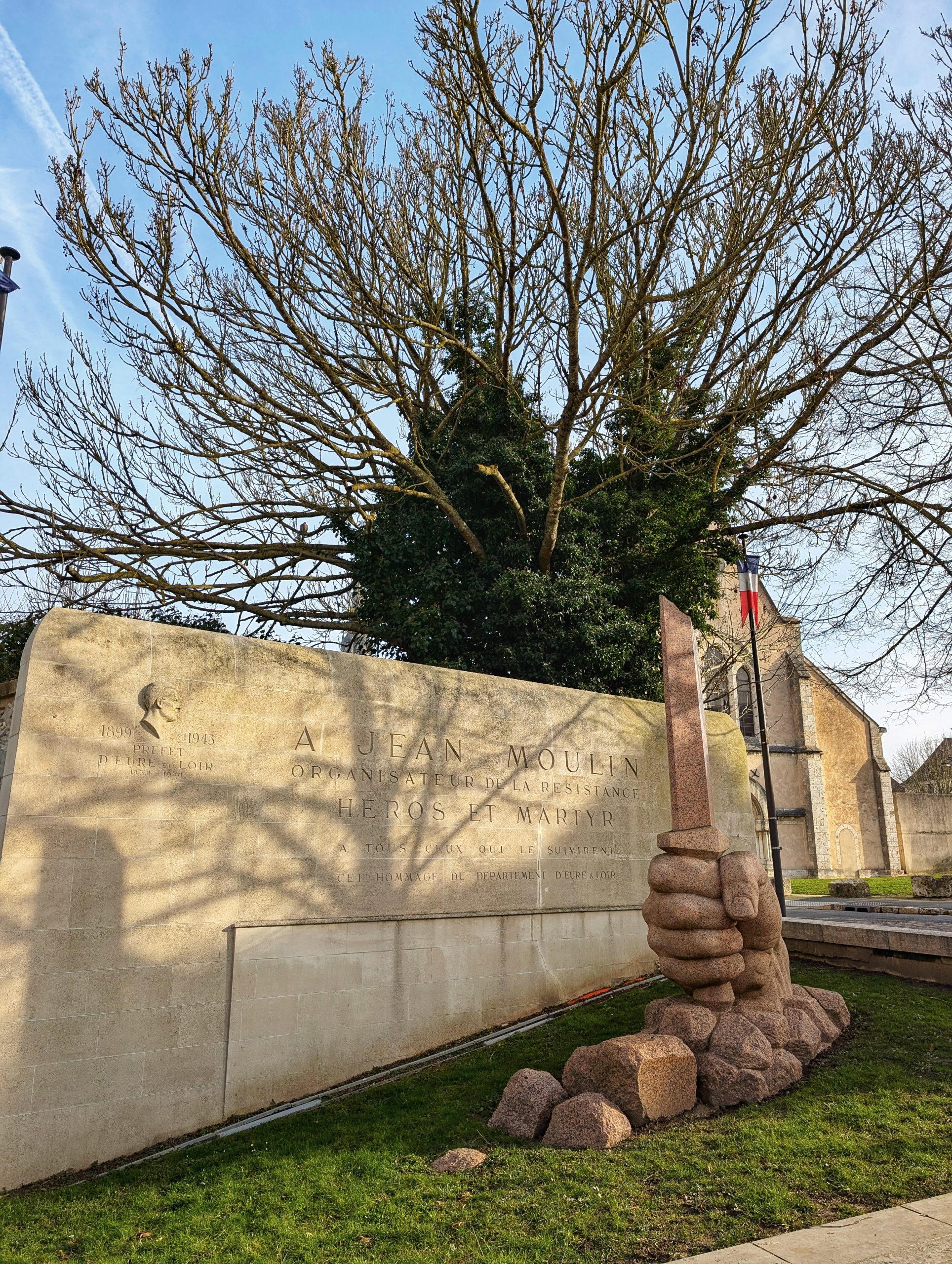 En continuant sur l’Esplanade de la Résistance, on rejoint la place Général de Gaulle. On y trouve une stèle de Jean Moulin qui fut préfet de 1939 à 1940.
