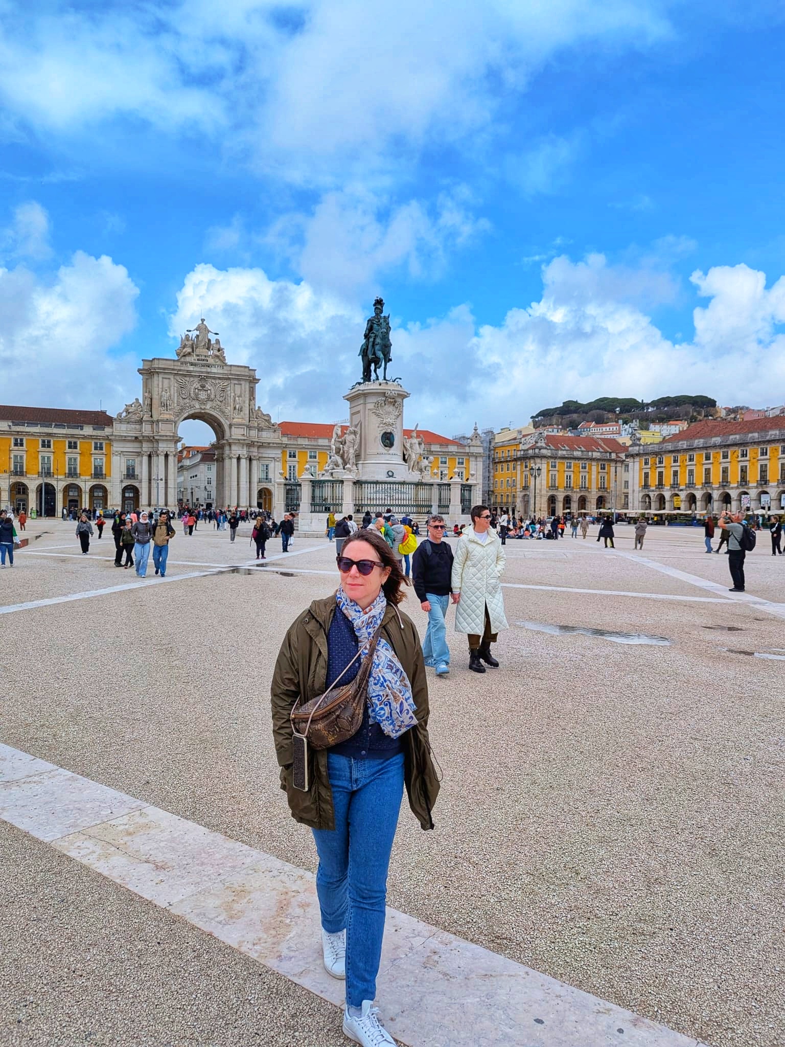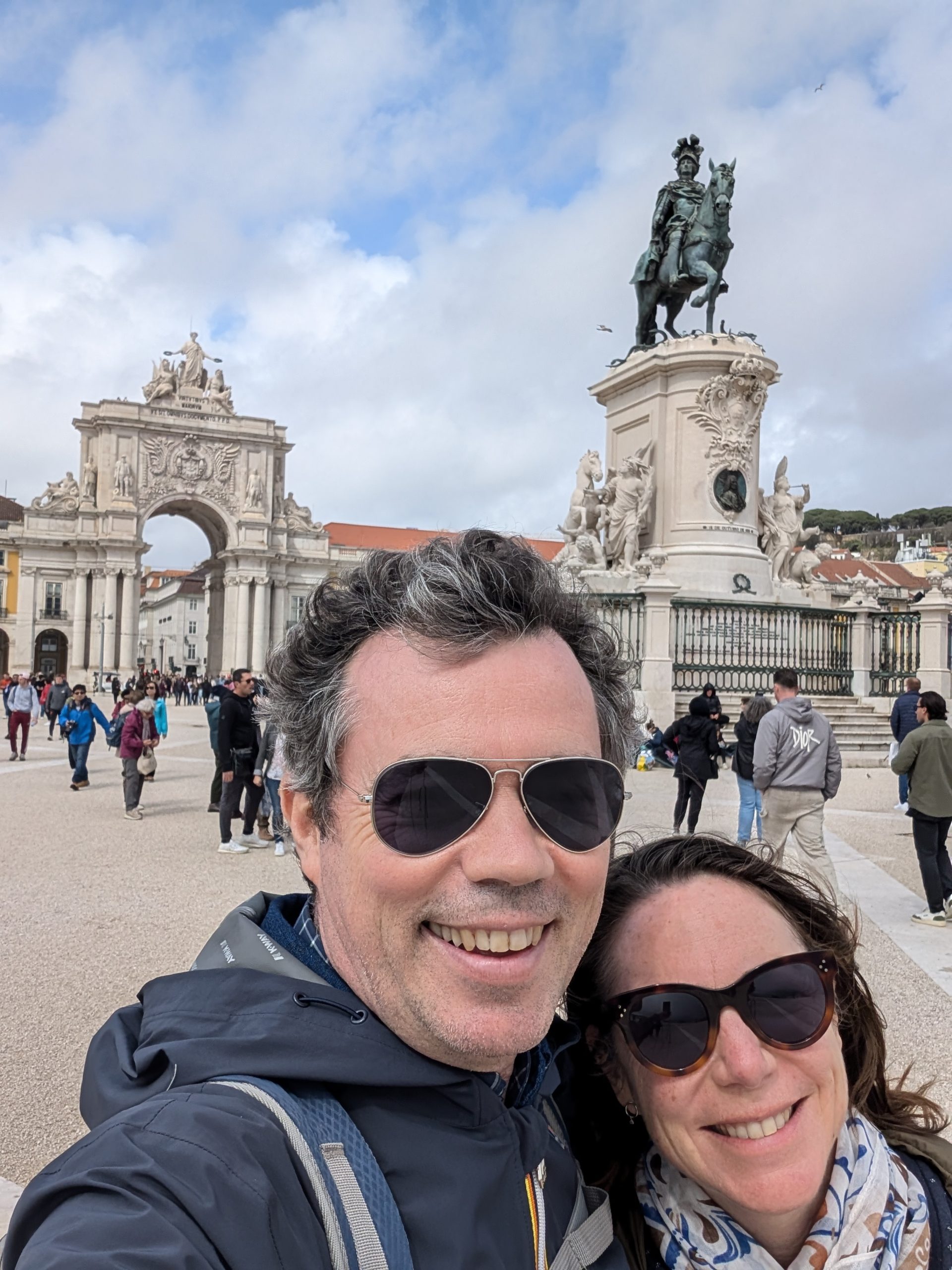 On emprunte alors la rue très touristique Augusta qui mène à la célèbre place du Commerce. Avant d’y arrive, on passe sous l’Arc de Triomphe. Cette place est très belle et vaste. Au centre, une statue représente le roi Joseph 1er, qui a notamment reconstruit Lisbonne après le tremblement de terre de 1755. Et droit devant nous les rives du Tage.