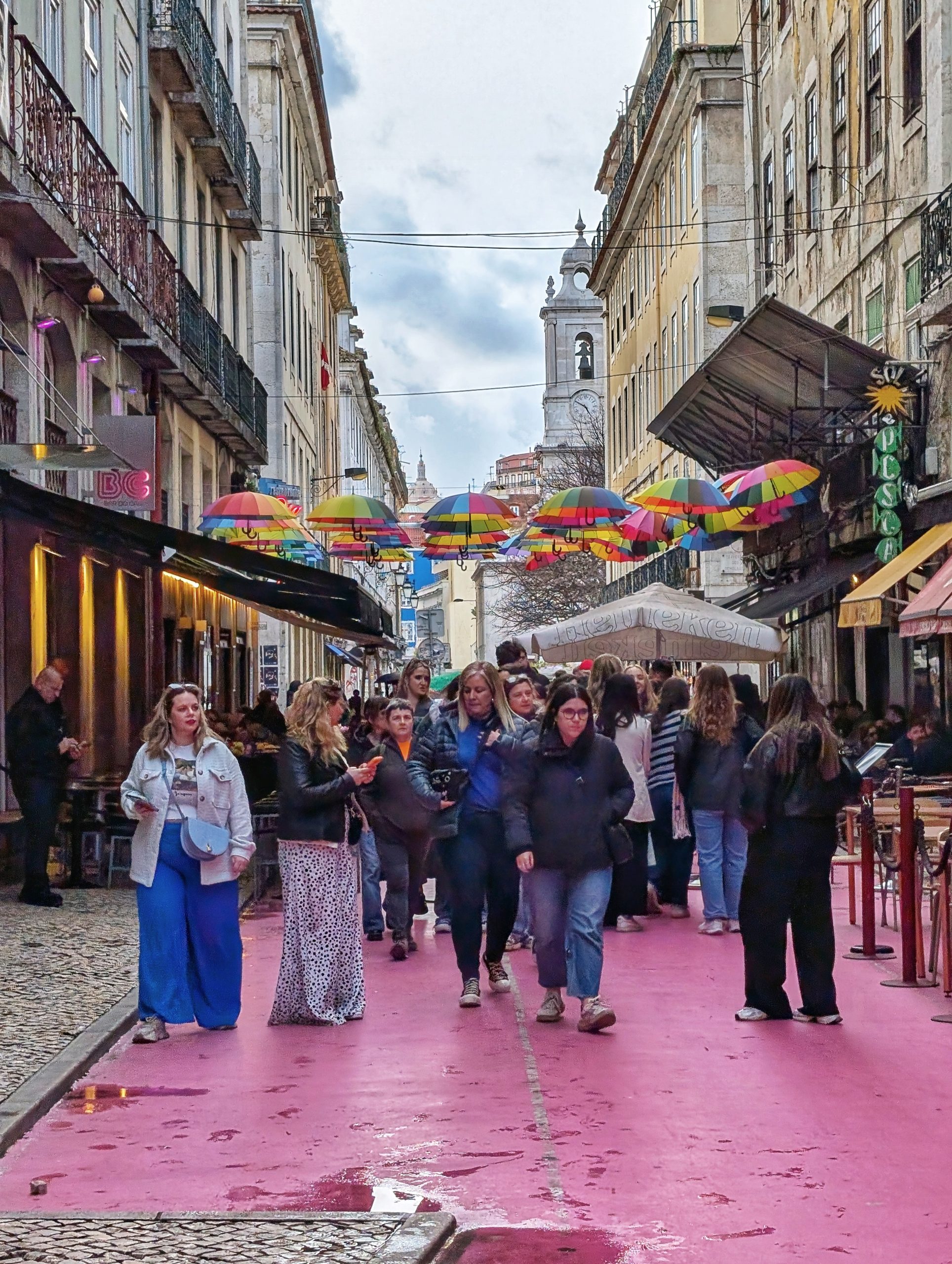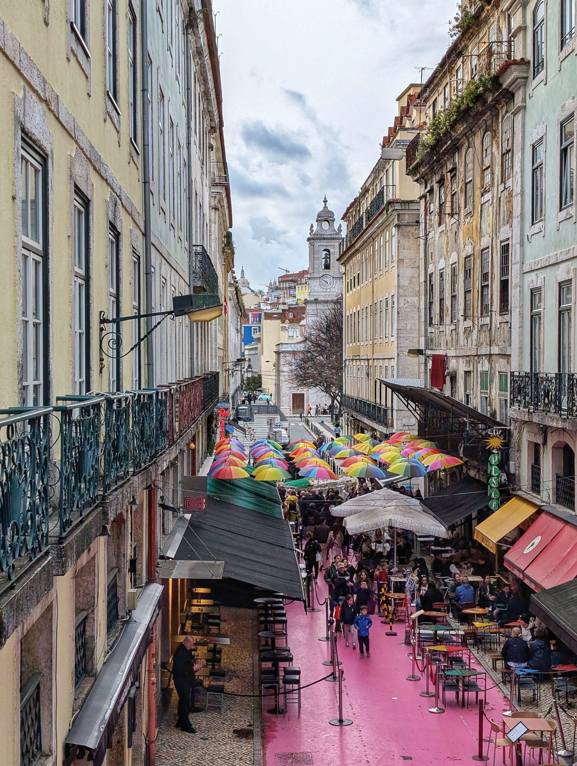 Après nous être rendus en bord du Tage, nous somme remontés (et là ça grimpe !!!). Sur le chemin, nous avons aperçu la Pink Street. On n’a pas trouvé de grand intérêt. Le sol est rose et il y a des parapluies c’est tout.